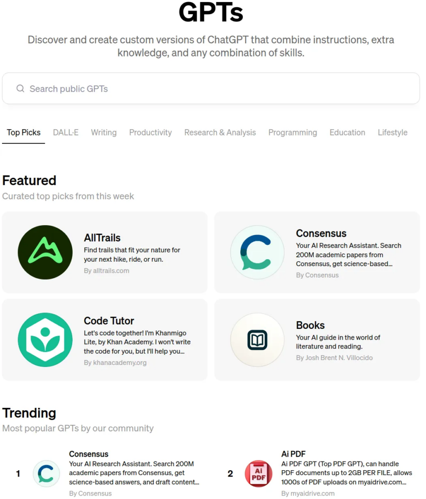 Vous pouvez explorer tous les GPT existants ici https://chat.openai.com/gpts. Vous y trouverez ceux qui sont en vedette, en tendance ainsi que ceux créés par l’équipe ChatGPT tout en haut. Vous pouvez également les parcourir par thématiques (écriture, productivité, recherche, éducation en programmation et style de vie) ou vous pouvez simplement rechercher en utilisant la barre de recherche en haut.