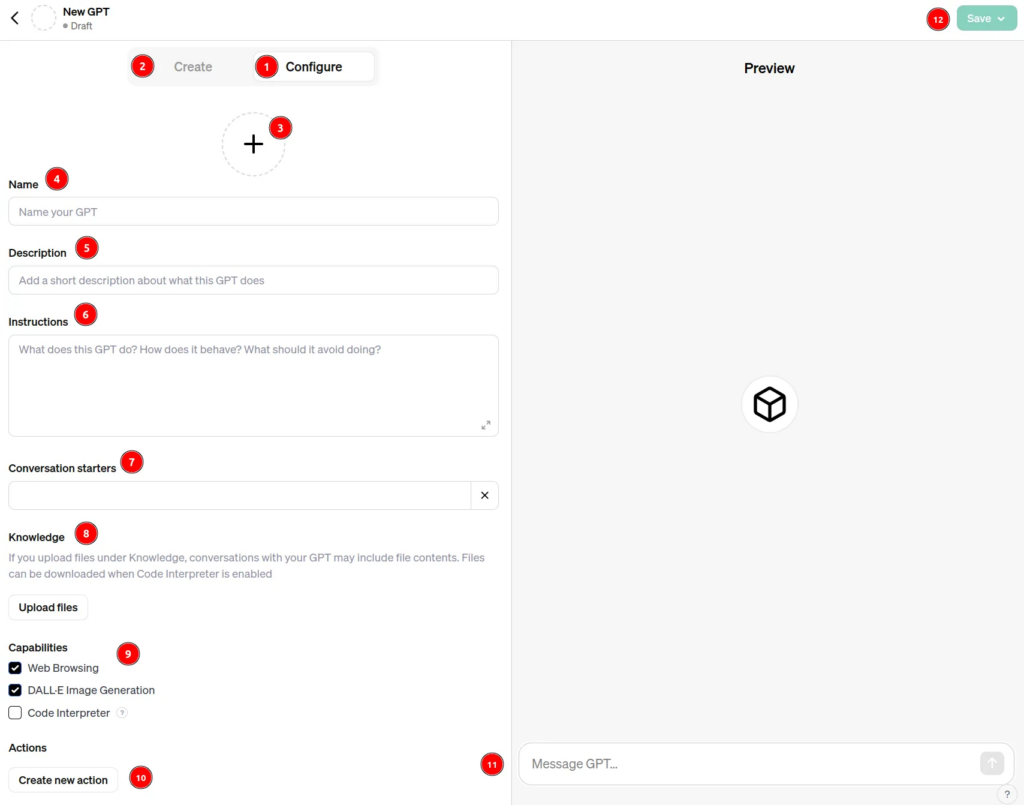 tout d’abord, vous avez besoin de cliquer sur le bouton vert « + Create » en haut à droite du GPTs store. Ensuite, vous accédez à l’interface ci-dessous que j’explique juste après.